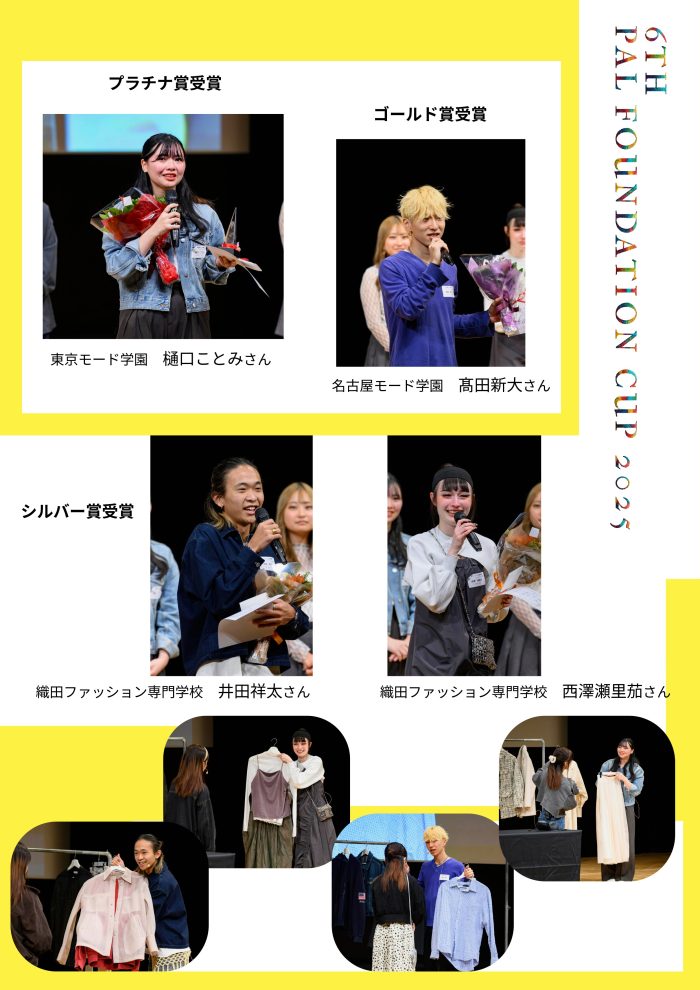 順位 賞 学校 氏名 1位 プラチナ賞 大阪文化服装学院 浅野 瑞穂 さん 2位 ゴールド賞 大阪モード学園 竹下 ひなた さん 3位 シルバー賞 横浜fカレッジ 山原 早恵 さん 名古屋ファッション専門学校 佐野 晏里 さん 今後もファッションビジネスを目指す学生の方々の目標となる大会にしていきたいと思っております。